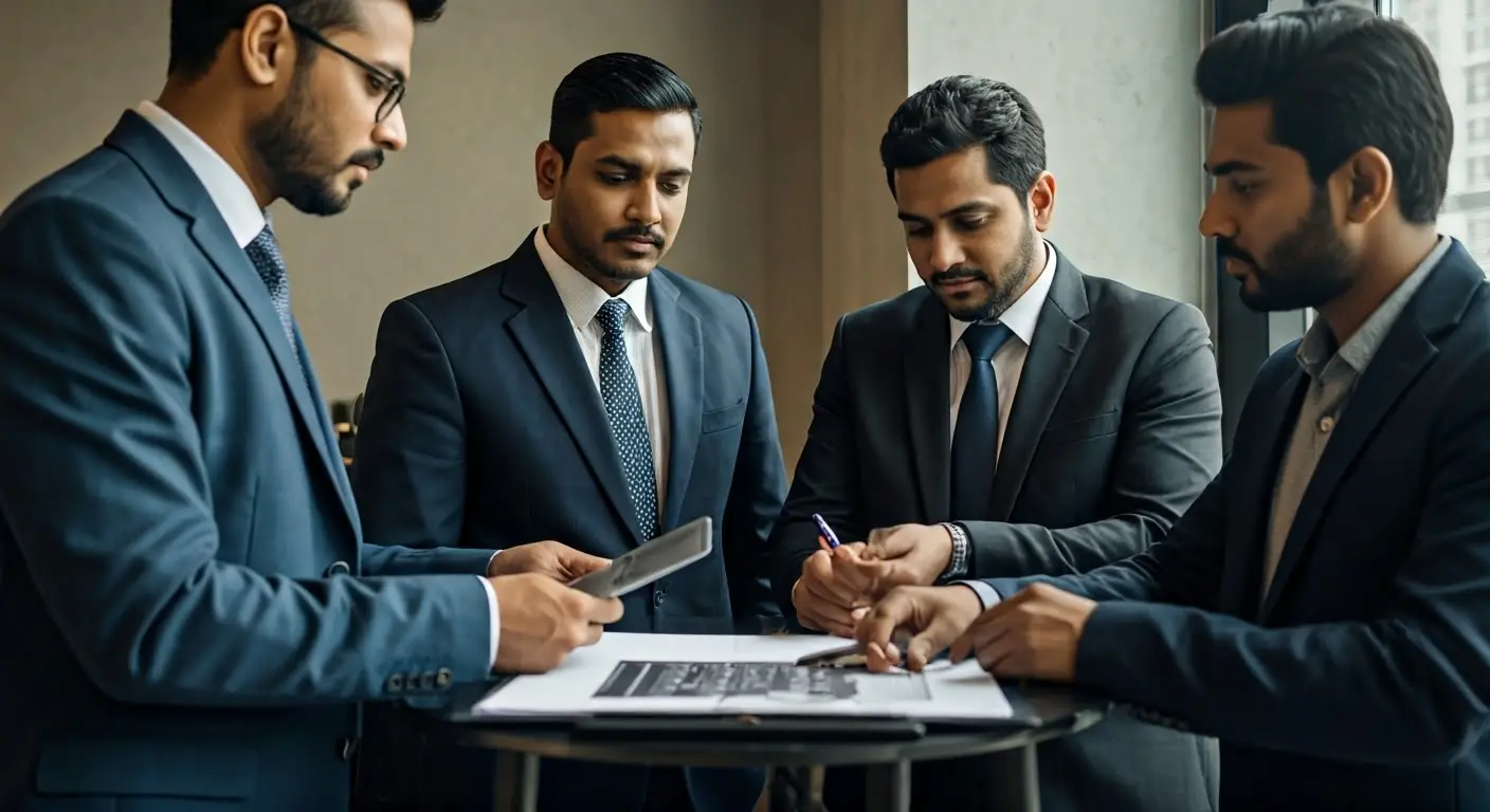 Legal experts reviewing contracts and registrations